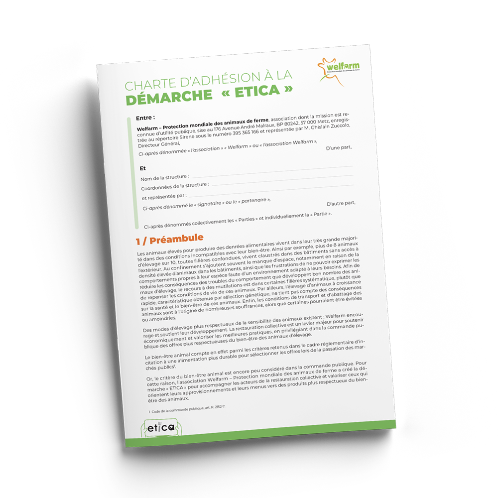 ETICA est une démarche de l’association Welfarm pour accompagner les cantines vers des approvisionnements plus respectueux des animaux d’élevage. ETICA est la seule démarche, en France, qui soit à destination de la restauration collective et centrée à 100% sur les animaux.